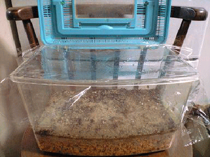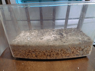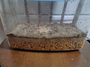 | レイアウト ☆底の黄色い物は鹿沼土です(ホームセンターで購入サイズ色々安価) ☆表面は川砂です購入時は汚れてます、よく水洗いして使ってください。(ホームセンターで購入可) ☆黒い物体は炭です脱臭清潔のため(頂き物ですが) 水ごけ ☆遊び用レンガストレス発散に(ホームセンターで割れて捨ててあるものを頂きました!) ☆虫よけに防虫シート(ホームセンターで購入可) ☆エサ入れ容器(ペットボトル底の部分500mlカッターナイフで切り取って使っています。注意!) |